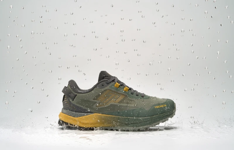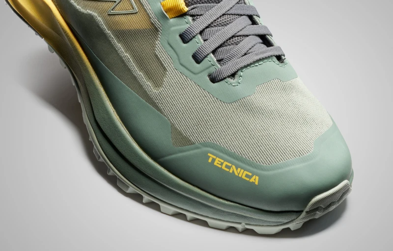 Das Obermaterial ist durch eine Schicht aus TPU-Folie geschützt, die auf das Polyamidnetz laminiert ist, um an kritischen Stellen wie der Ferse, der Zehenkappe sowie den mittleren und seitlichen Zonen für zusätzliche Haltbarkeit zu sorgen.