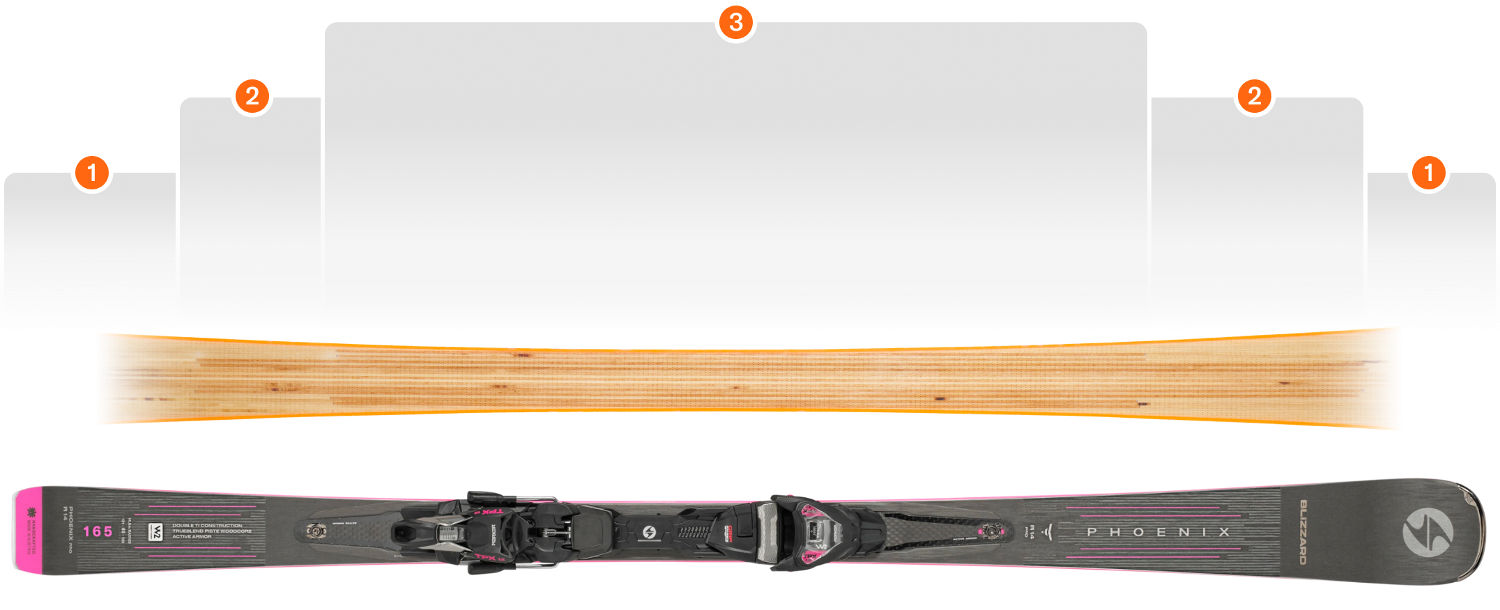 Le Trueblend Woodcore Piste est conçu avec une zone de flexion plus dure au centre, qui assure la stabilité et l'adhérence sur les bords, une zone de flexion moyenne devant et derrière la fixation qui assure le contrôle, et une zone de flexion douce en pointe et en queue qui permet d'amorcer et de relâcher facilement le virage. La technologie Trueblend nous permet de contrôler précisément le flex sur toute la longueur du ski et dans toutes les tailles.